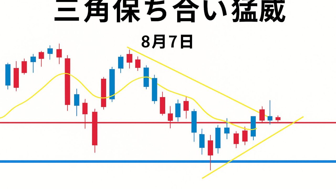 週足チャートでは、長期下降トレンドの上限ラインと、5月から続く上昇の下限ラインが収束しつつある。