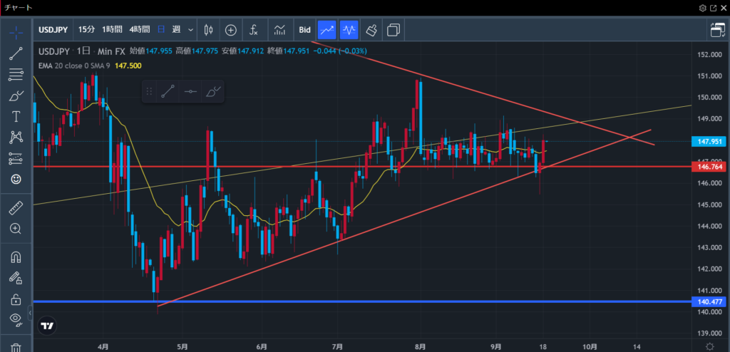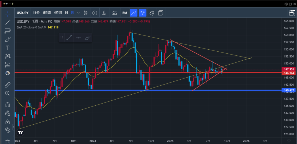上値は150円付近、下値は140円前半までが想定される中、現在値は三角の中心に近い147円台後半。明確なトレンド発生には至っておらず、長期的には方向感に欠ける。