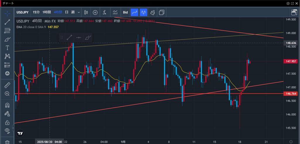 4時間足では、上昇後の一服感が見られ、短期的には上昇の勢いが鈍化。