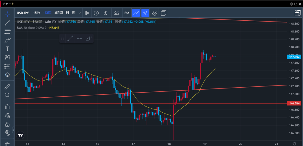 特に148.30円付近のレジスタンスを明確に抜けるまではロングは慎重に、146.70円を割り込むまではショートも様子見が無難。