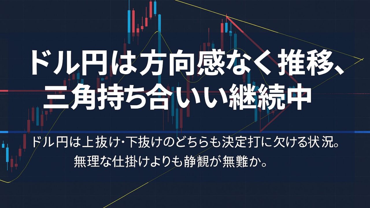 ドル円は、注目されていた三角持ち合いを上抜けることができず、再び境界線内に戻された。ファンダメンタルズに乏しい中、チャート主導の展開が続いており、特にサラリーマンや兼業トレーダーにとっては「静観」が妥当な判断となりやすい局面だ。トレンド方向は未確定であり、上も下も決定打を欠く展開が続く。