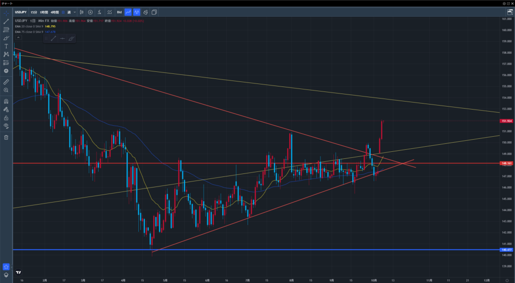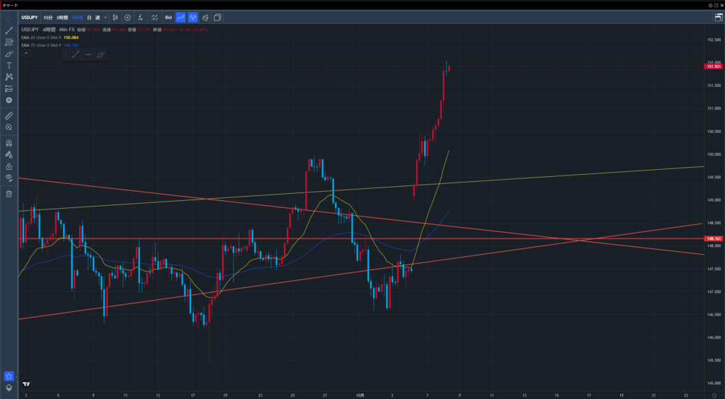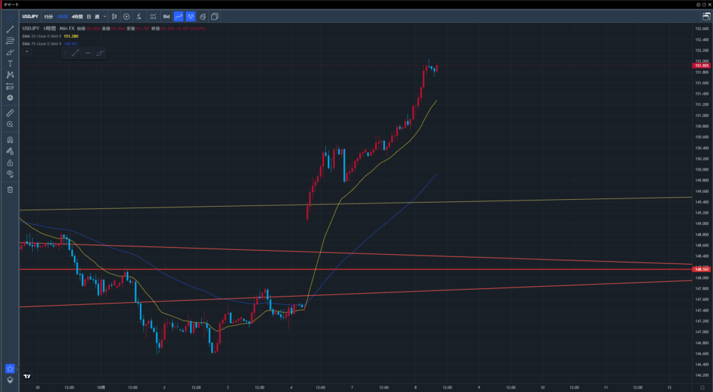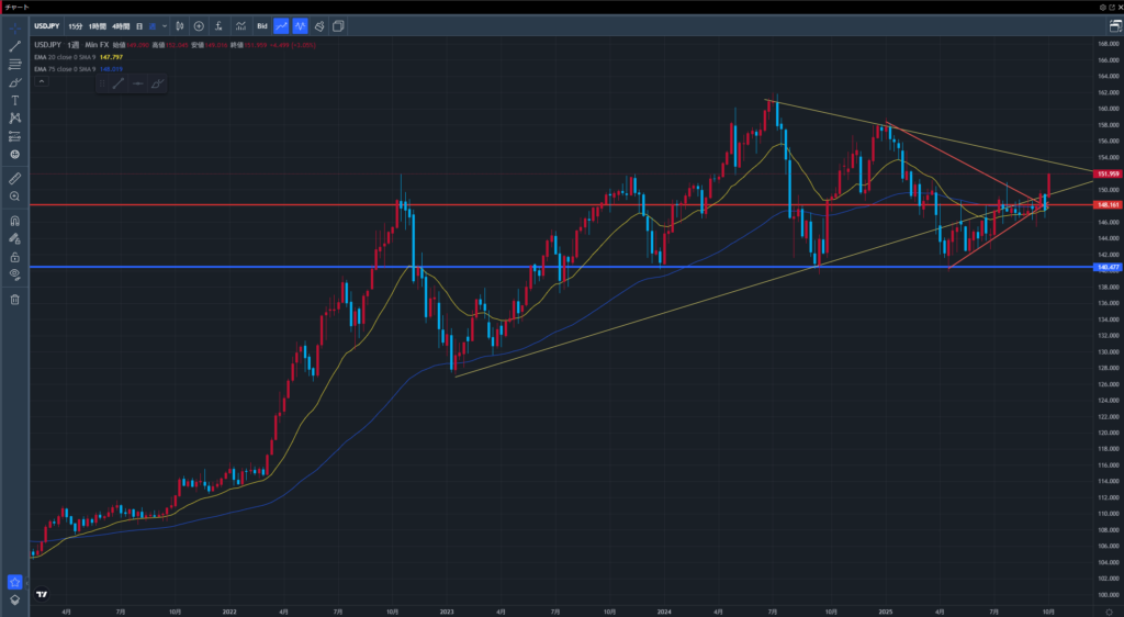 直近では151.5〜152円が一時的なレジスタンスとして意識されるが、ブレイクすれば新たな上昇波動へ。