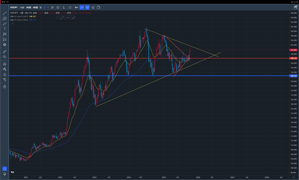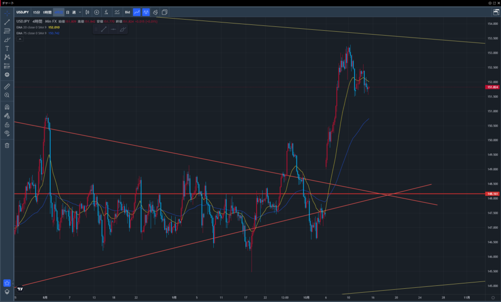 サポートは148円ラインで、ここを割れない限り上昇トレンドは継続と判断。
