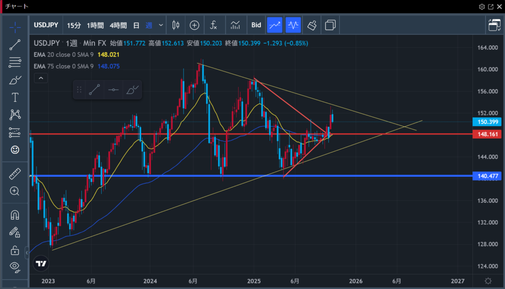 エントリーは反発確認後の押し目買い、または150円割れを狙った短期売りが有効。