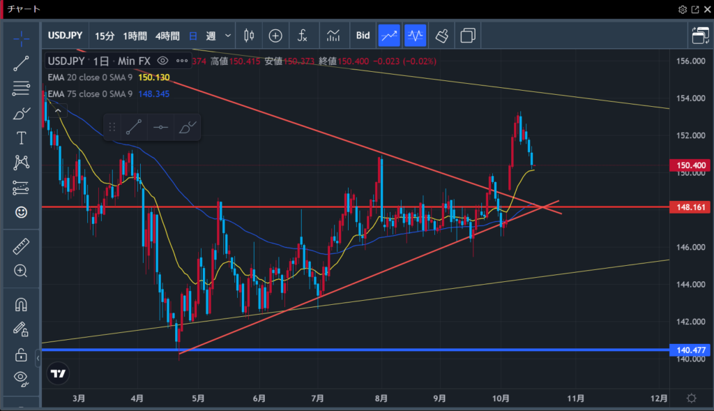 ドル円は153円の天井をつけたあと、反落が進行。現在は150円前半で下値を探る展開となっている。