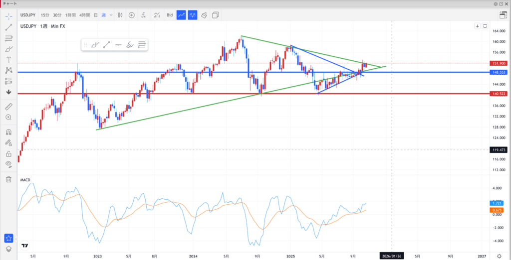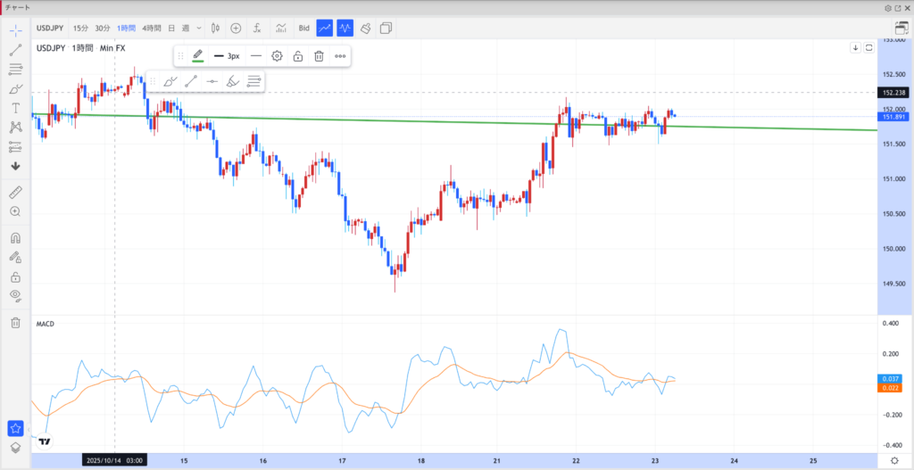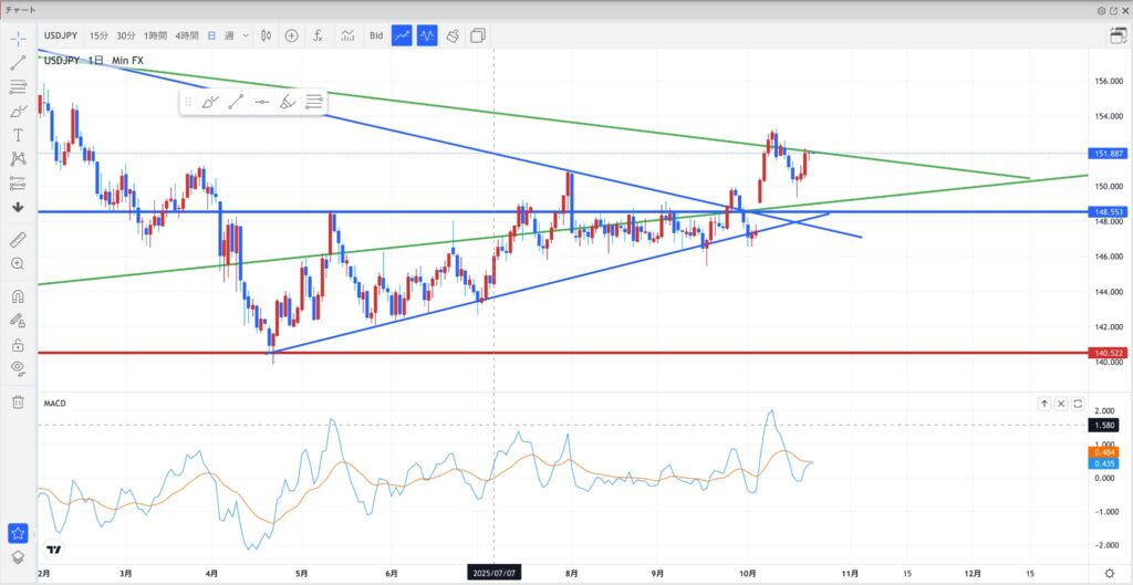151.50円が下値サポートとして機能しており、ここを支えに再度152円トライを狙う構図。