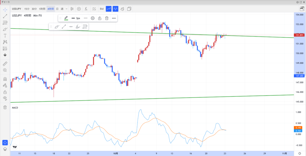 4時間足では上昇チャンネル上限に接近中。151.90円付近で一時的な高値圏もみ合い。