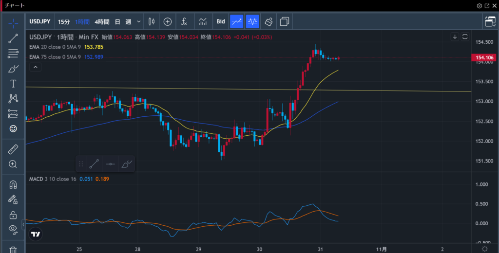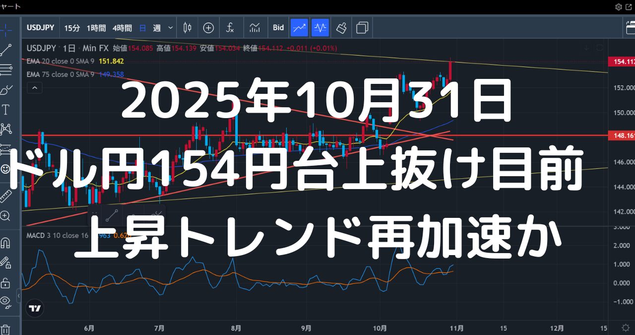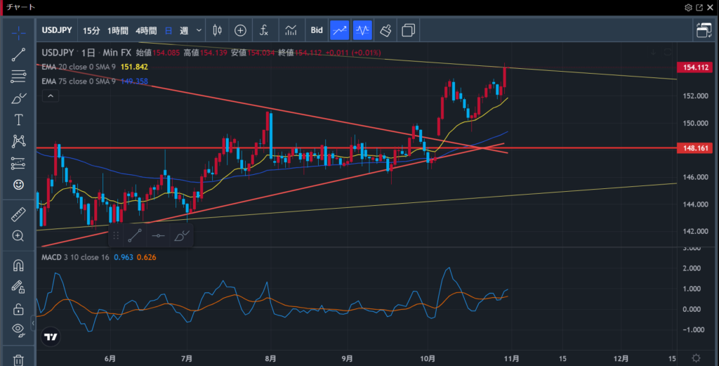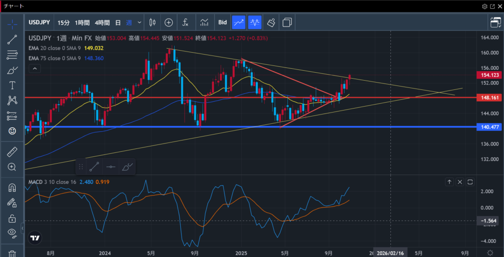 ドル円は154円台目前まで上昇。週足・日足ともにサポレジ転換を果たし、上昇トレンドが鮮明になりつつある。