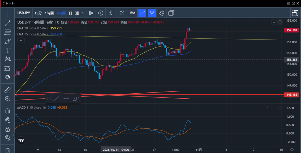 日足では20EMAが75EMAを上抜け、上昇基調を確認。先週形成した148円のサポートラインが強固に機能し、買い圧力が継続。