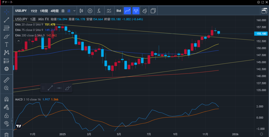 先週のブレイクアウトに対する「リテスト(調整)」が、非常に綺麗な形で入った。かつてのレジスタンスライン(154円〜155円付近)が強固なサポートとして機能し、今週の下ヒゲがそれを証明している。