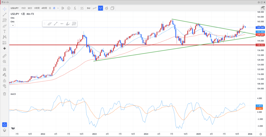 しかし、この155円という水準は、テクニカル分析において極めて重要な意味を持つ「サポレジ転換」の候補地である。本日は今週の値動きを総括し、来週以降のトレンドを決定づけるこの攻防の行方を徹底分析する。