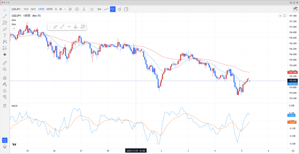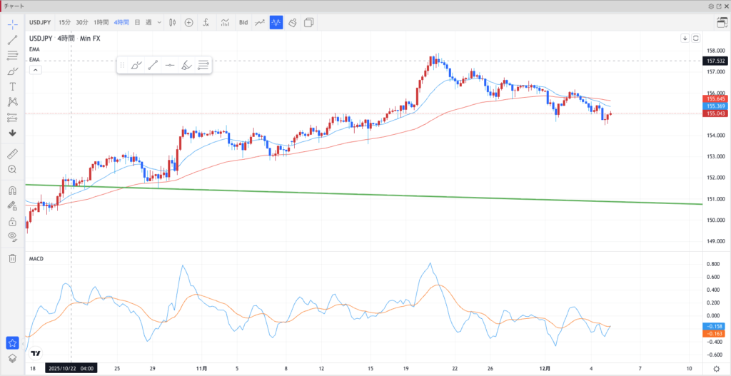 綺麗な下降トレンドを描き、現在は長期EMA(赤色・200EMA相当)付近での攻防となっている。直近では155.00付近で下げ渋る動きも見られるが、まだ明確な反転シグナル(高値切り上げなど)は出ていない。