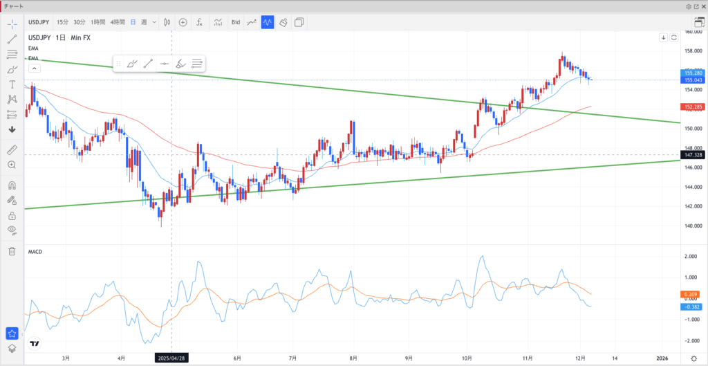 ここを明確に下抜けると、次は赤色の長期EMA(152円台)を目指す深い調整シナリオが浮上するため、本日の日足確定は極めて重要である。